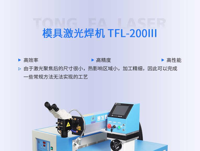 通發(fā)激光國內(nèi)率先推廣國產(chǎn)模具激光焊機,TFL-200Ⅲ升級型世界500強選用,針對精密塑膠模具激光焊、鏡面塑膠模具激光燒焊、精密壓鑄模具激光焊補.為國內(nèi)模具修復(fù)行業(yè)做出巨大貢獻(xiàn)。