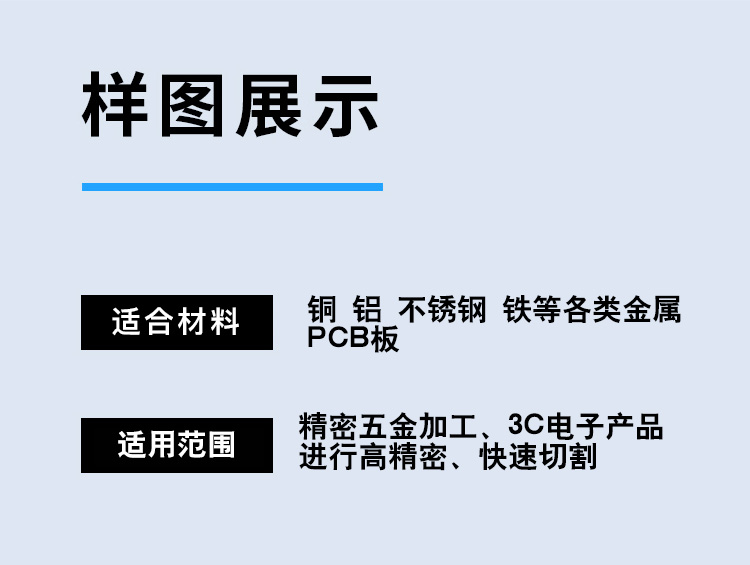 適用范圍廣,可加工銅、鋁、不銹鋼、鐵、pcb板、磁性材料等多鐘材料。幅面大小可選,長(zhǎng)度可根據(jù)用戶加工需求定制。切割速度快,效果光滑平整,切口沒(méi)有機(jī)械應(yīng)力,光滑平整無(wú)剪切毛刺。